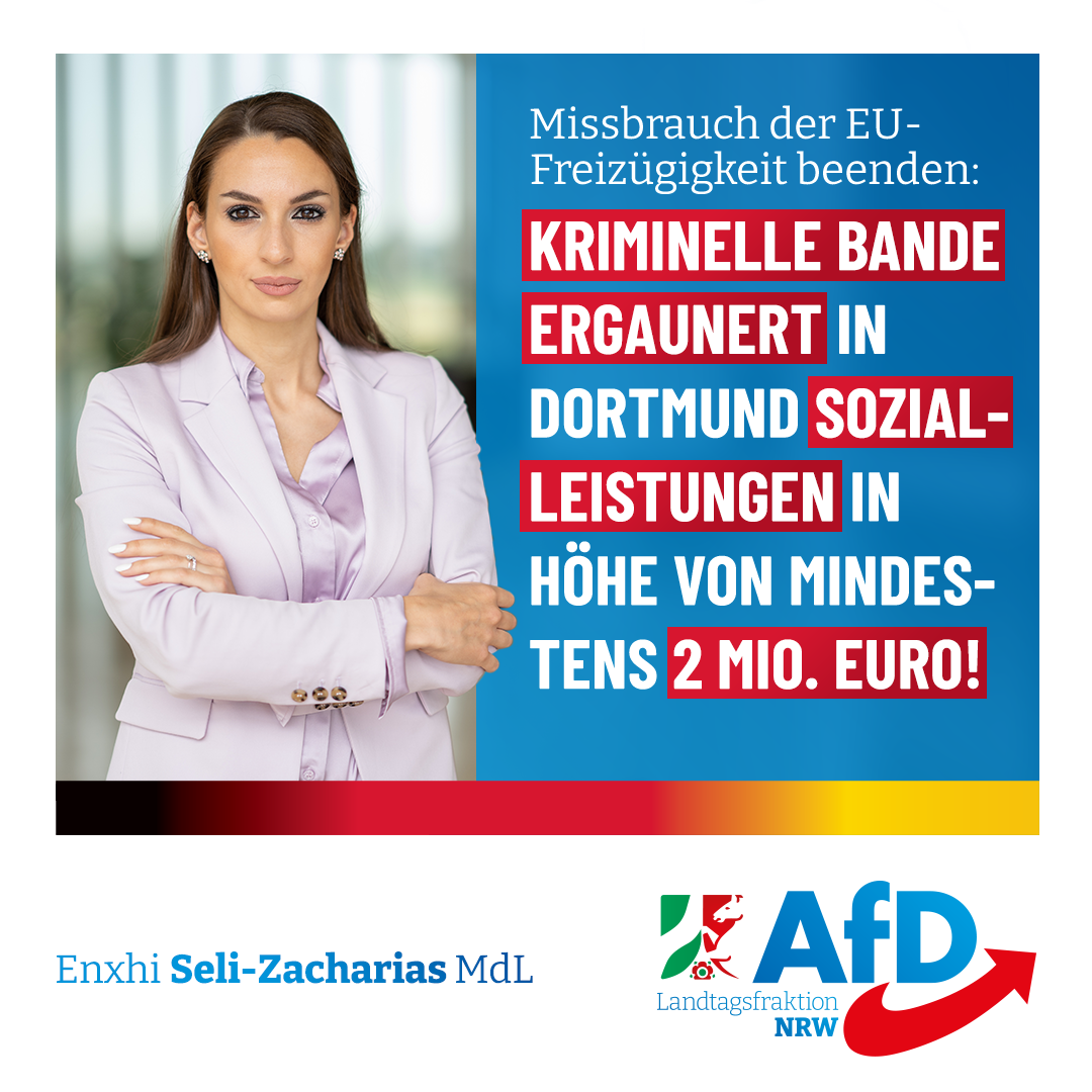 Rumänische Familien wurden jahrelang systematisch nach Deutschland gelotst, um Sozialleistungen wie Kindergeld und Hartz 4 zu erschleichen. Eine Großrazzia von Polizei und Staatsanwaltschaft im Ruhrgebiet deckte den organisierten Betrug jetzt auf. „Das Dunkelfeld dürfte in diesem Zusammenhang enorm sein“, kommentiert unsere integrationspolitische Sprecherin, Enxhi Seli-Zacharias. „Wir müssen den Missbrauch des Sozialsystems daher endlich durch restriktive Kontrollen und beharrliche Strafverfolgung verhindern. Ausländerbehörden müssen wir finanziell und personell verstärken, damit die Freizügigkeit von EU-Bürgern konsequent geprüft werden kann. Auch vom Recht, Wiedereinreisesperren zu verhängen, muss wesentlich entschlossener als bisher Gebrauch gemacht werden.“ Quelle: https://www.derwesten.de/staedte/dortmund/hartz-4-in-dortmund-rumaenen-kindergeld-sozialleistungen-kriminell-ergaunert-id235755107.html