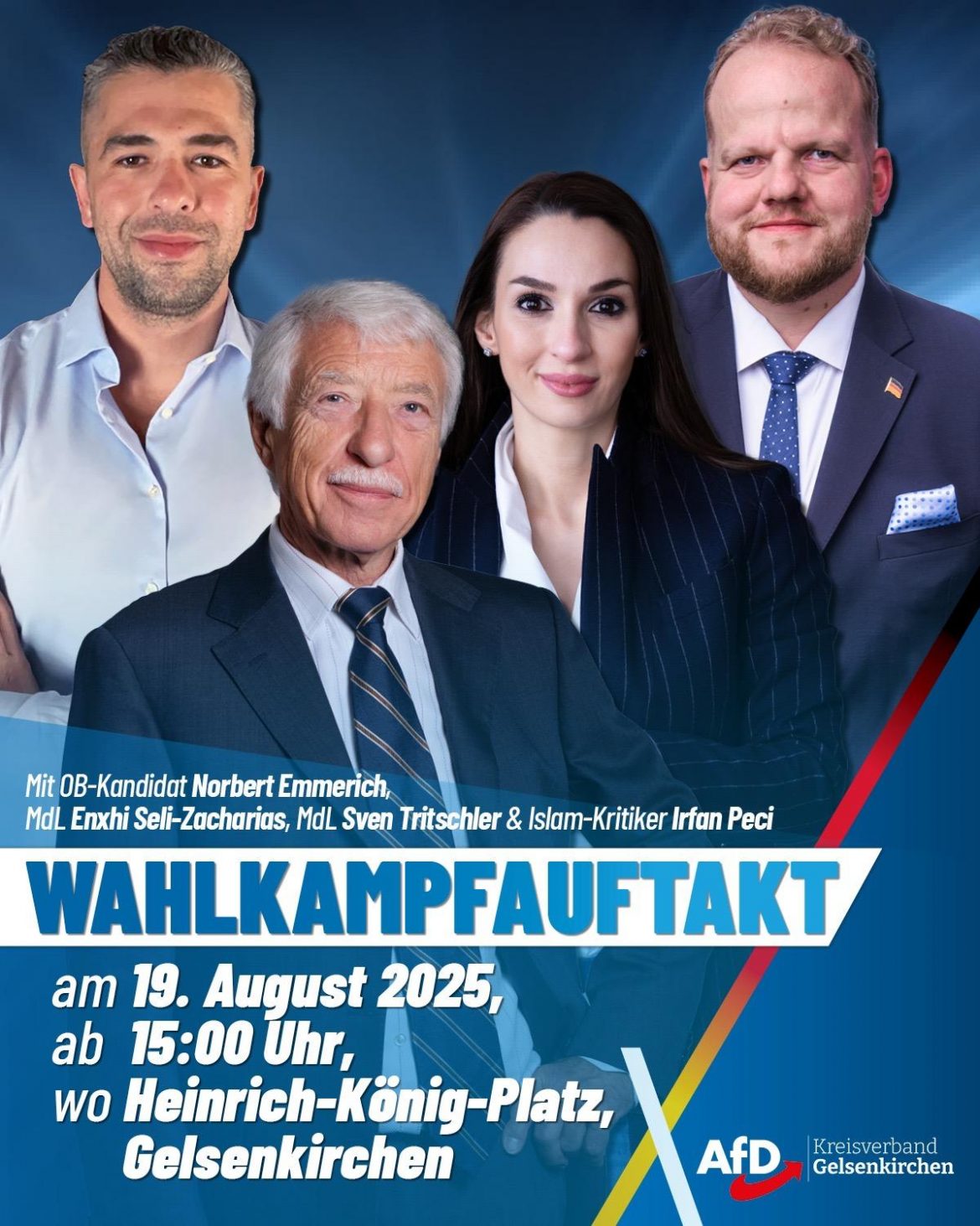 Im Rahmen des Kommunalwahlkampfs 2025 hat sich der Kreisvorstand dazu entschlossen am Dienstag, den 19.08.2025 um 15:00 Uhr eine Kundgebung auf dem Heinrich-König-Platz abzuhalten. Unser OB-Kandidat Norbert Emmerich, dem sichere Chancen auf die Stichwahl zugerechnet werden, wird seine Ziele für Gelsenkirchen darlegen und damit hoffentlich noch weitere Bürger für die AfD gewinnen können. Als Gastredner konnten wir den bundesweit bekannten Islamkritiker & Influencer Irfan Peci von der Bürgerbewegung Pax Europa und Sven Tritschler, den kommunalpolitischen Sprecher der AfD-Landtagsfraktion für uns gewinnen.