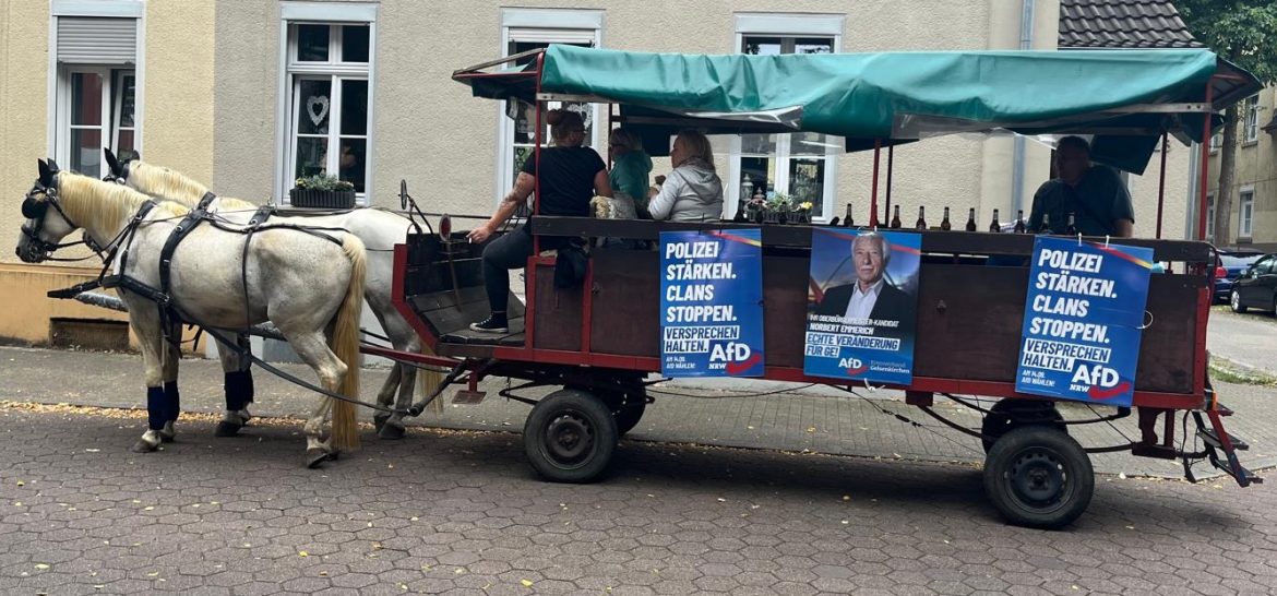 Am vergangenen Samstag startete unser OB-Kandidat Norbert Emmerich zur ersten von drei Planwagenfahrten durch Gelsenkirchen und die Premiere war ein voller Erfolg. Die Tour am 16. August führte am Samstagmittag durch Rotthausen, Neustadt und Ückendorf bis hin zur Feldmark. Schon das rhythmische Hufgeklapper der Pferde weckte Neugier, und viele Passanten blieben stehen, um zuzuschauen. Zahlreiche freundliche Menschen an den Straßen zeigten Interesse und spendeten Zuspruch. Ein schönes Signal für unseren Kandidaten und sein Team. Wir freuen uns schon auf die nächste Planwagenfahrt am kommenden Samstag, den 23. August, in Buer, und laden alle herzlich ein, dabei zu sein. Auch am 13. September wird Norbert Emmerich noch einmal mit dem Planwagen unterwegs sein, um mit den Bürgerinnen und Bürgern ins Gespräch zu kommen.
