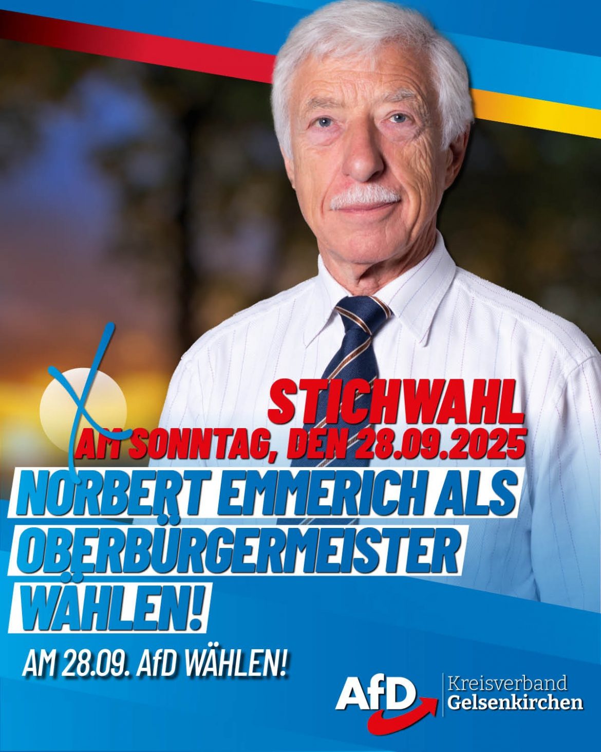 Liebe Unterstützer,am Sonntag, den 28.09.2025, entscheidet sich in der Stichwahl, wer unser nächster Oberbürgermeister wird. Unser Kandidat Norbert Emmerich steht weiterhin mit voller Überzeugung für die Zukunft Gelsenkirchens bereit. Damit er eine echte Chance hat, brauchen wir jede einzelne Stimme. Bitte gehen Sie am Wahltag zahlreich wählen und motivieren Sie auch Freunde, Familie und Bekannte, ins Wahllokal zu gehen. Gemeinsam können wir ein starkes Signal setzen und dafür sorgen, dass Gelsenkirchen eine neue Richtung einschlägt. Ihre Stimme macht den Unterschied!