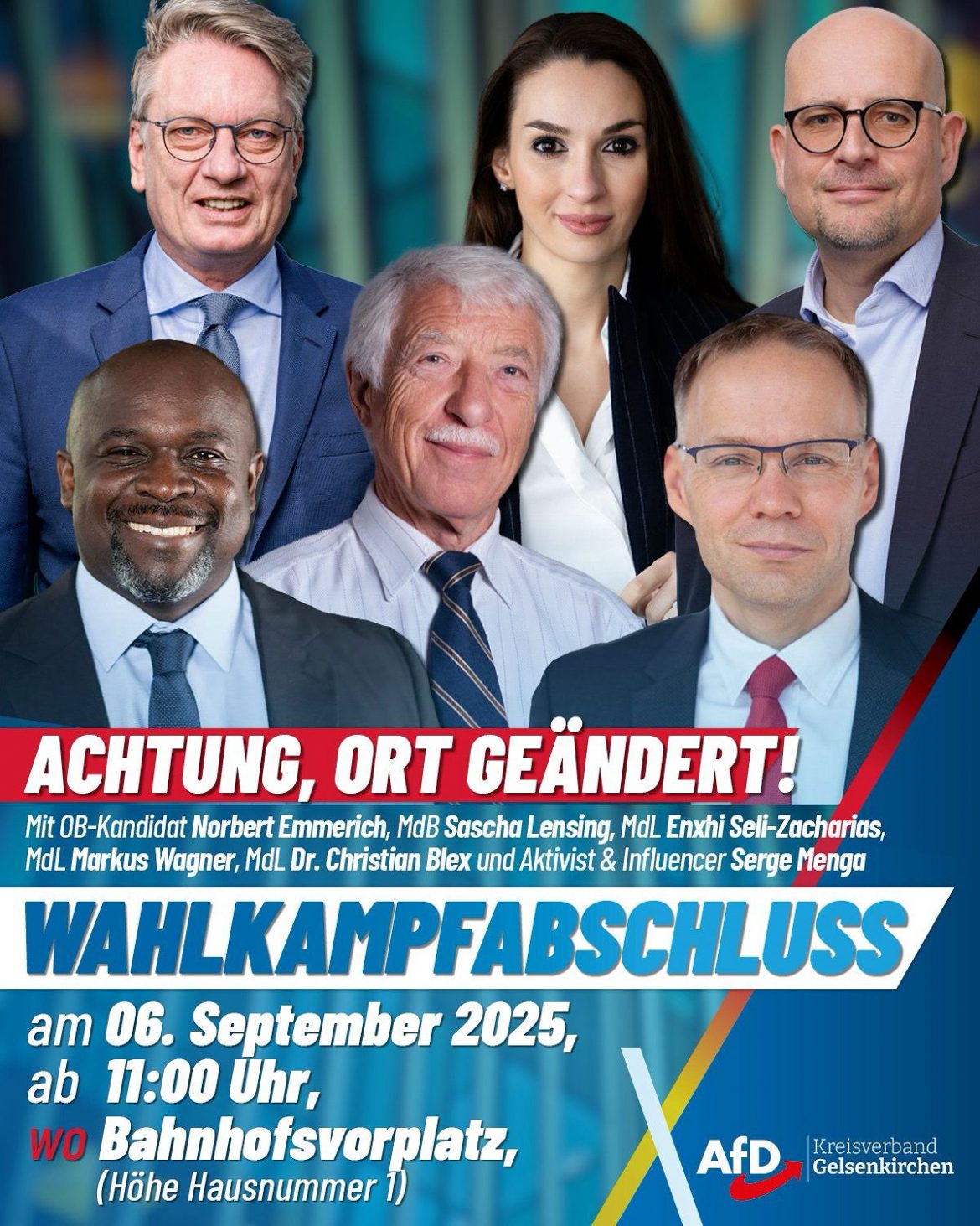 Im Endspurt des Kommunalwahlkampfs laden wir herzlich zur nächsten AfD-Kundgebung ein:🗓 Samstag, 06.09.2025⏰ Beginn: 11:00 Uhr📍 Bahnhofsvorplatz (Höhe Hausnummer 1, nahe Ausgang Bahnhofscenter) (Hinweis: Der ursprünglich geplante Ort, Heinrich-König-Platz, musste nach Rücksprache mit der Polizei wegen einer Parallelveranstaltung rund um das PUR-Konzert in der Veltins-Arena verlegt werden.) Unser OB-Kandidat Norbert Emmerich wird seine Ziele für Gelsenkirchen vorstellen und aufzeigen, warum wir mit Optimismus in die Wahl am 14. September gehen. Als besondere Gäste erwarten wir: Die Moderation übernimmt unsere Gelsenkirchener Landtagsabgeordnete und Kreissprecherin Enxhi Seli-Zacharias. Kommen Sie vorbei, bringen Sie Freunde und Bekannte mit und setzen Sie gemeinsam mit uns ein Zeichen für Sicherheit, Ordnung und eine starke Zukunft in Gelsenkirchen! Wir freuen uns darauf, Sie am Samstag begrüßen zu dürfen.
