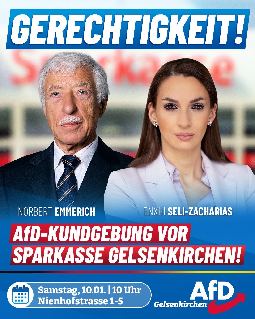 Liebe Freunde und Mitbürger,   wir versammeln uns am Samstag, den 10. Januar 2026, um 10 Uhr vor der Sparkasse in Buer.  Lassen Sie uns gemeinsam mit den Bürgern, den Betroffenen, für Gerechtigkeit einstehen!  Dort werden wir gemeinsam mit Bundestags- und Landtagsabgeordneten der AfD mit Bürgern diskutieren und ihnen zur Seite stehen!  Zeigen Sie Solidarität und schauen Sie bitte vorbei!